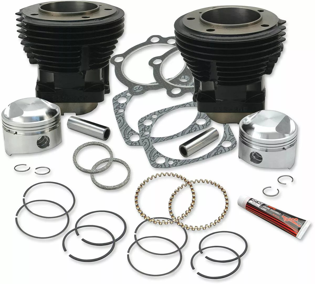 - Includes S&S 3.5" bore high tensile cast iron cylinders, 3.5" bore forged standard compression pistons for 80" (4.25" stroke) engines with rings and wristpins, head gaskets, S&S stainless steel bolts with washers, base nuts and base gaskets