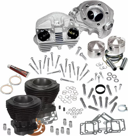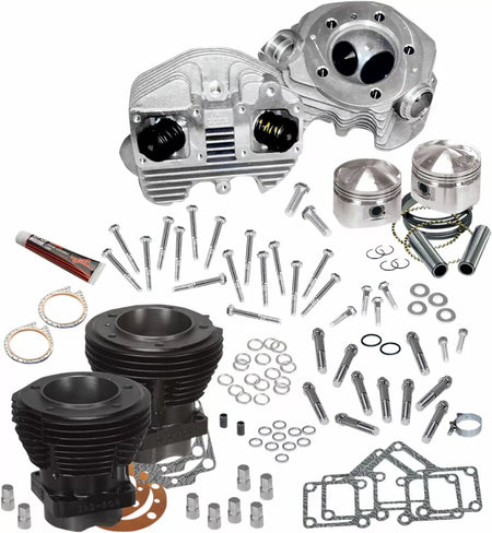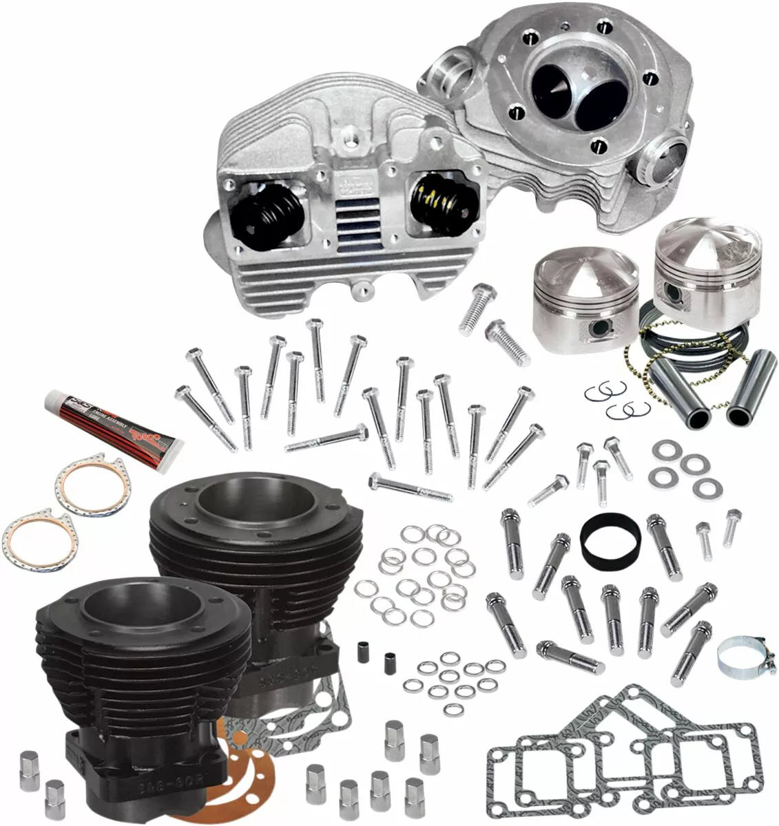 - Include a set of S&S Shovelhead-style cylinder heads, a pair of S&S stock bore cylinders (3-7/16" for 74" engines or 3-1/2" for 80"), forged 8:1 compression pistons complete with rings and wrist pins, manifold clamps, manifold seals, all required hardware, and gaskets