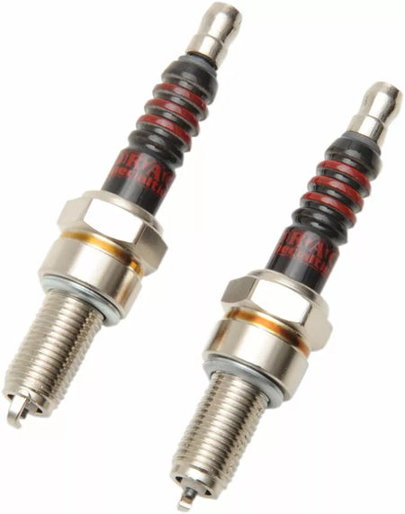 - Plugs have a unique look with a black ceramic body and bold red logo/script