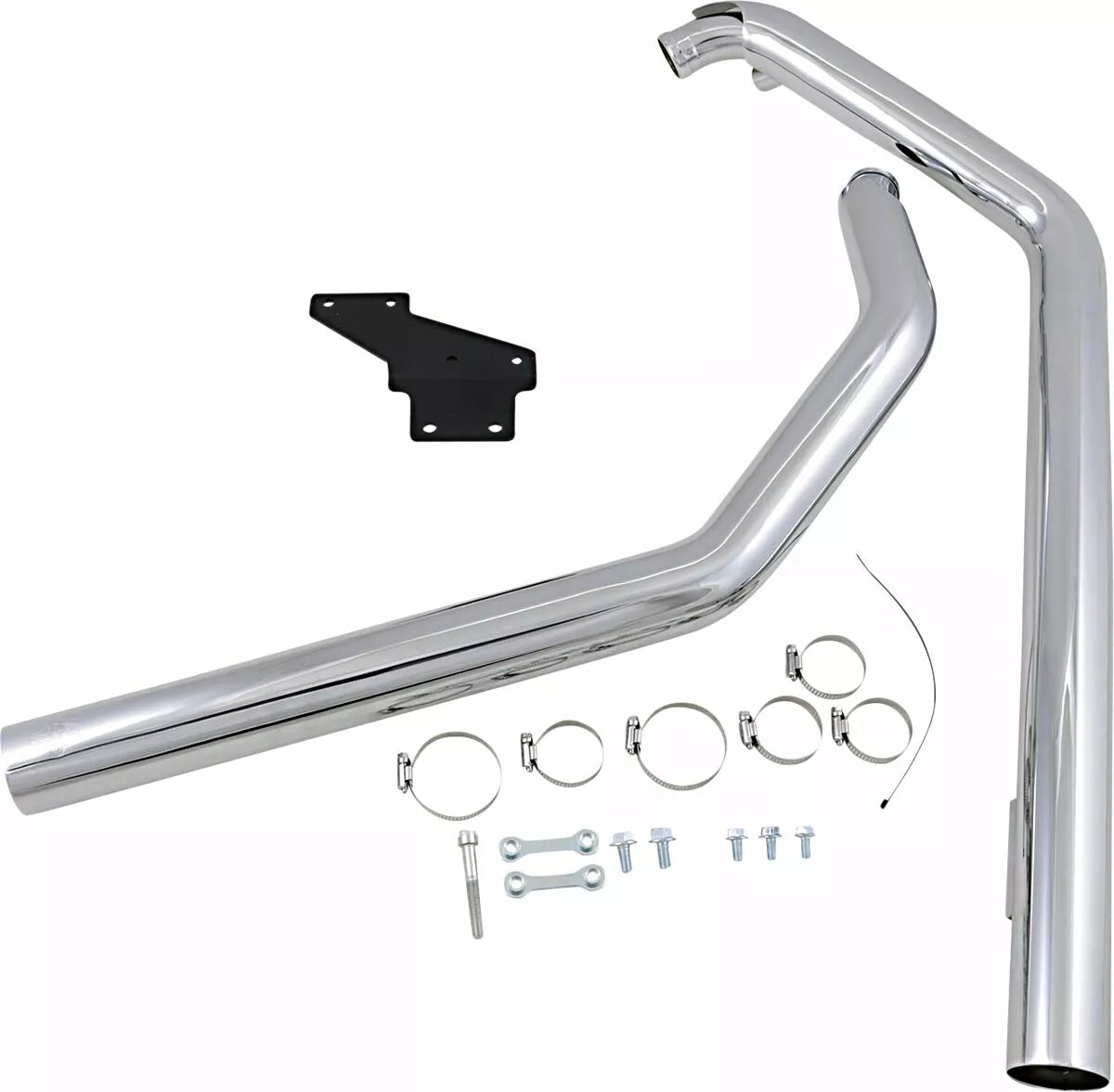 - 2-1/4" mufflers are welded to 1-3/4" head pipes; all are covered by one-piece, large 2-1/2" full-coverage, full-length chrome header/muffler heat shields that are virtually blue-proof