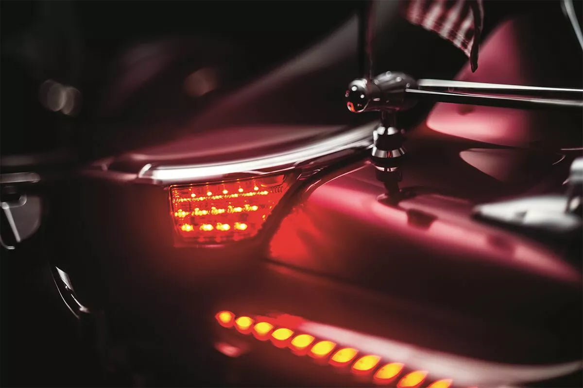 - Sculpted accents feature LED run and turn functions illuminating in red