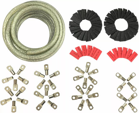 • Each kit contains the following: 25' cable (1), 1/4" terminals (20), 3/8" terminals (8), 5/16" terminals (12), black heat shrink (40) and red heat shrink (12)