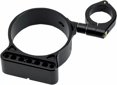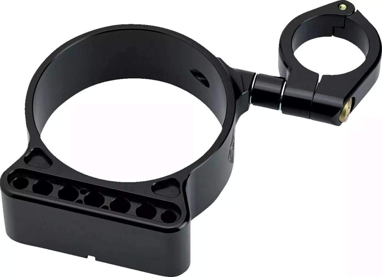 - Attaches to the left fork tube and is virtually adjustable, in every direction, and clears the fuel tank easily