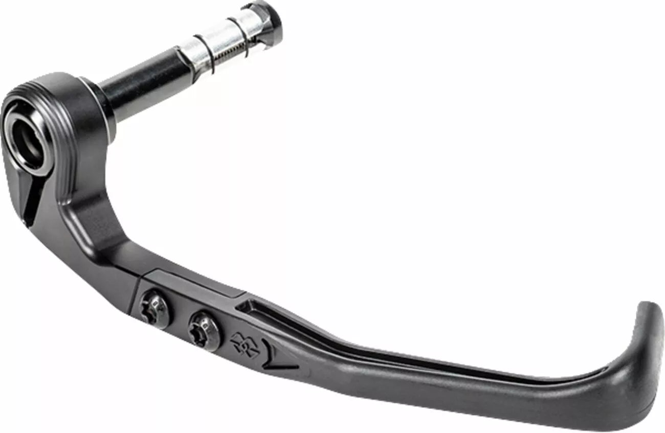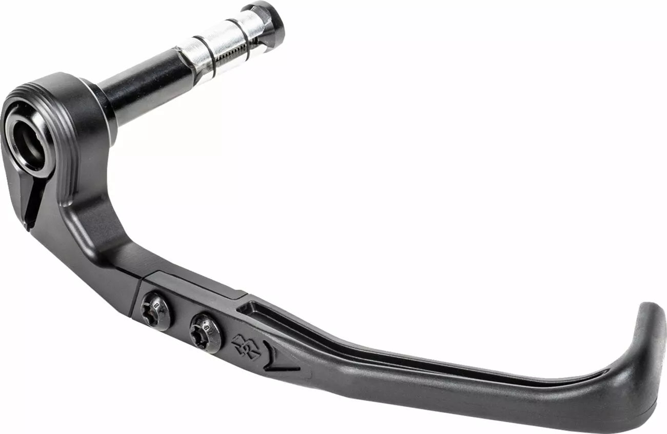 - Two-part structure of the lever protector is paired with an arm made of resistant plastic-glass fiber mix, a clamping element for the steering tube and a black, hard-anodized aluminum bracket
