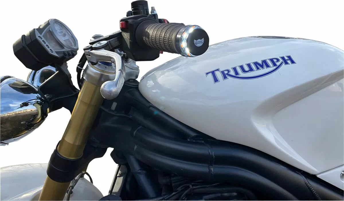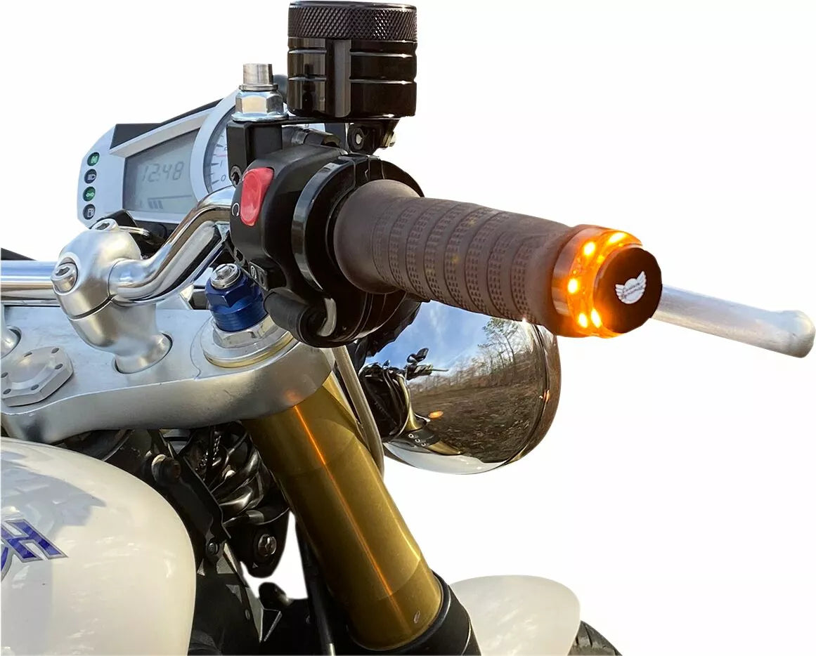- Add a super bright white running light and eye-catching amber turn signal to the end of your handlebars