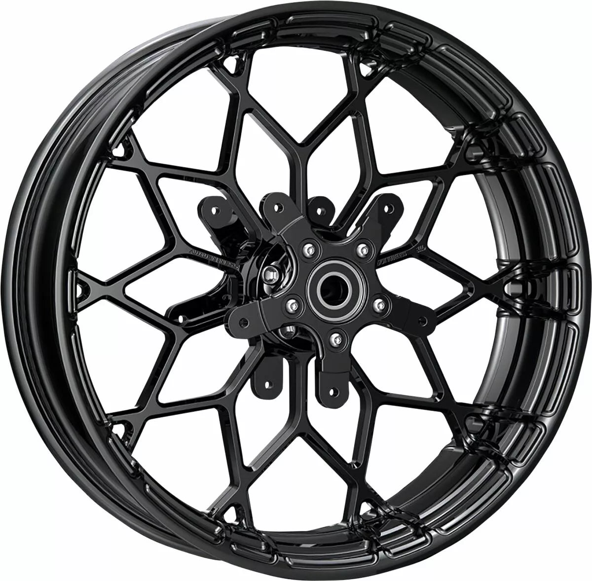 - Gloss black powder coated forged aluminum rim (not cast) with gloss black anodized hub and disc adapter