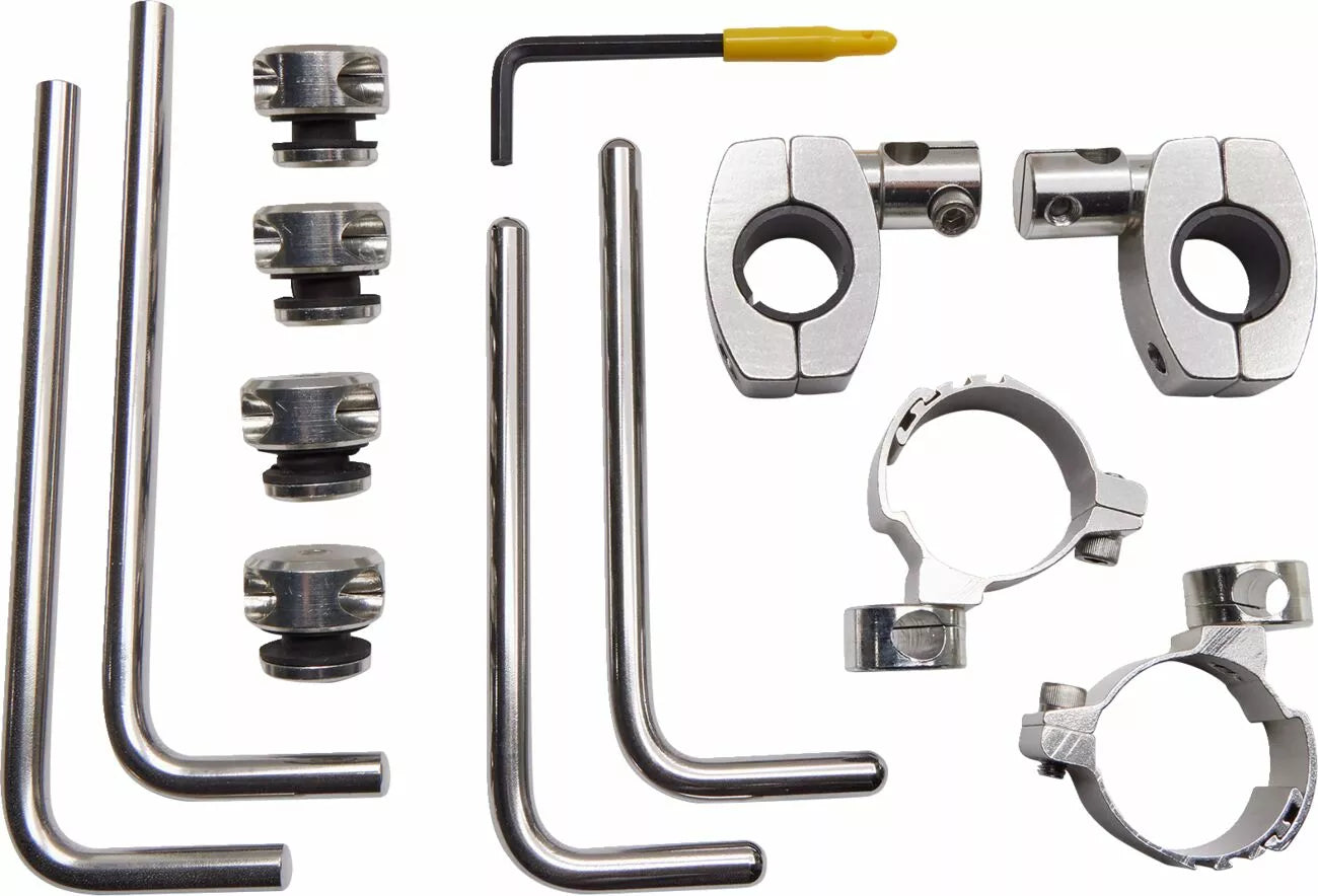 - Included four-point mounting hardware consists of polished billet aluminum handlebar clamps that fit 1" and 7/8" handlebars (with sizing bands), aluminum adjustable fork clamps that fit 35mm to 41mm forks and stainless steel support rods and socket-head screws