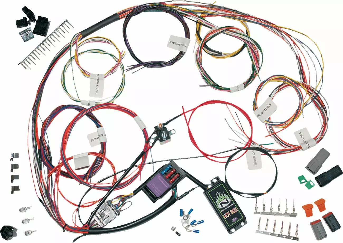 - Coil wire with ring terminals, tachometer, horn, oil sending unit, brake switch and neutral switch wiring with terminals
