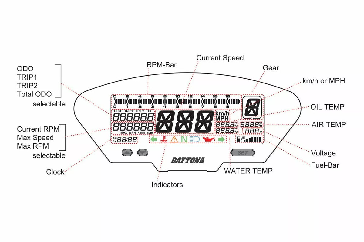 • Speedometer, MPH (0-250 MPH) & KM/H (0-399KM/H) selectable