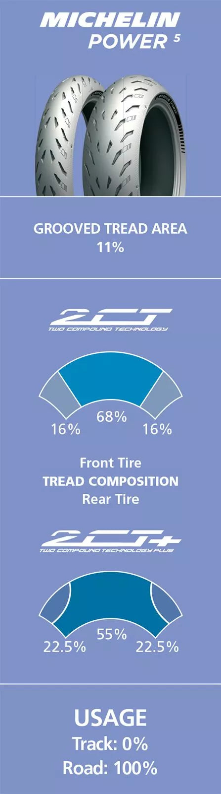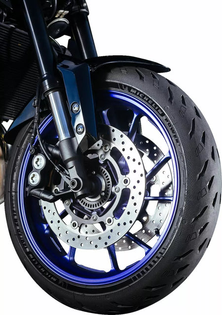 - Delivers more agility and a 7.87% greater lean angle compared to leading competitors [Based on a blind internal test with independent supervision on May 19, 2020 in Ladoux, France using a 2019 BMW S1000 R fitted with 120/70 ZR 17 front and 190/55 ZR 17 rear tires comparing cornering speed and lean angle using Michelin® Power 5 tires vs. Bridgestone® Battlax Hypersport S22, Continental® ContiSport Attack 4, Dunlop® SportSmart MK3, Metzeler® Sportech M9 RR, and Pirelli® Diablo Rosso III. Actual on-road results may vary].